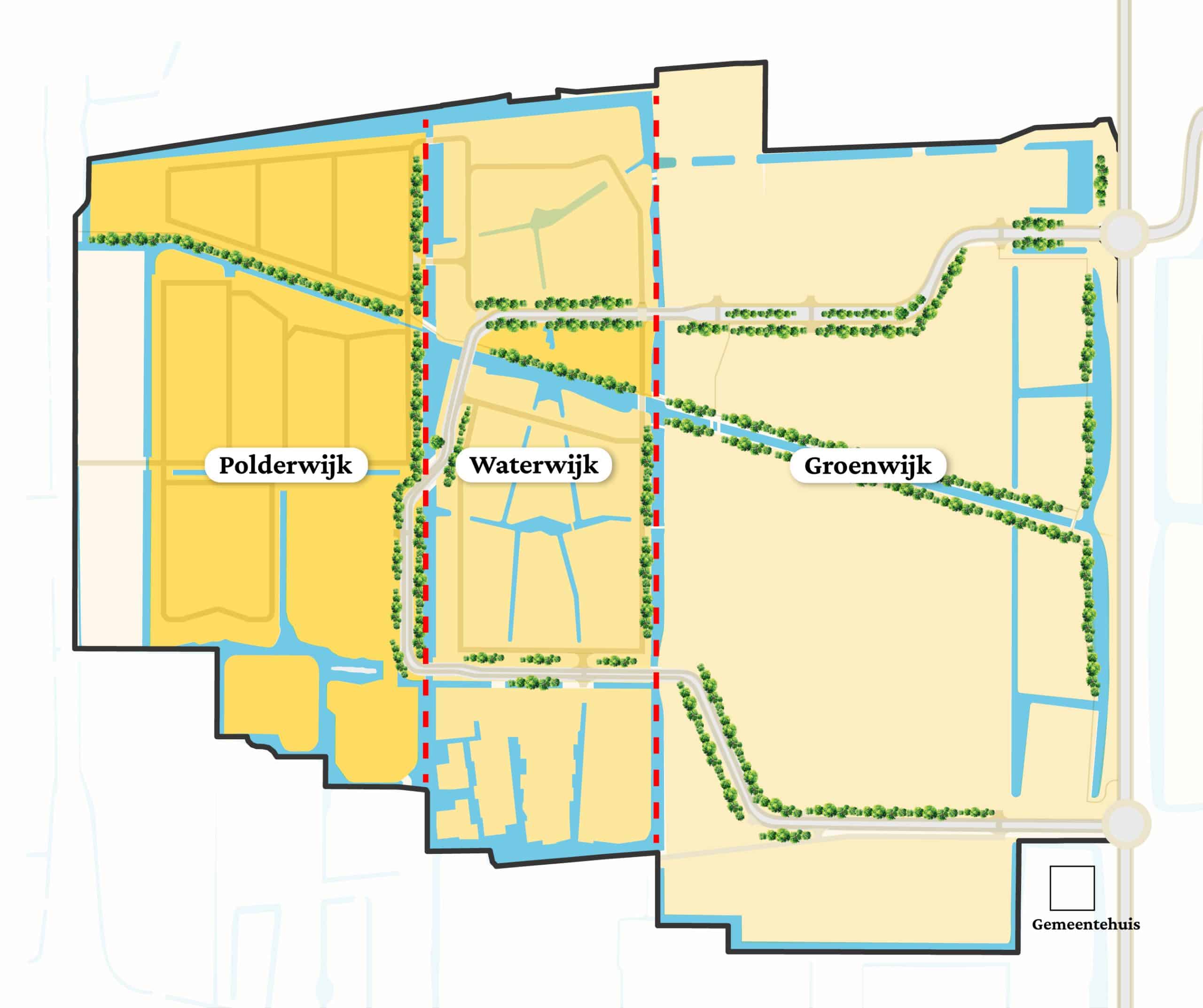 Ben je benieuwd naar de indeling van de wijk? Wilderszijde bestaat uit drie wijken (zie afbeelding 1): Polderwijk, Water en Groenwijk, die elk zijn opgedeeld in verschillende bouwvelden.